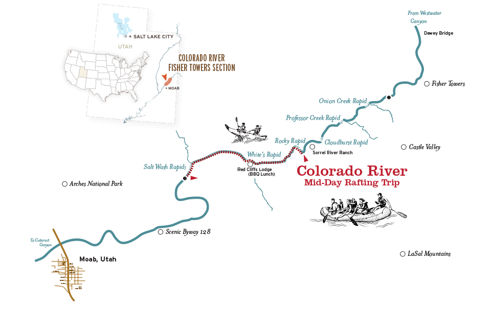 This section of the Colorado River combines calm stretches with splashy Class I–II rapids, and Class III waves may appear in spring. It’s not as extreme as Westwater or Cataract Canyon, but it provides enough action to keep families, first-timers, and even teens engaged. Guests often describe it as a “perfect balance” of excitement and relaxation.What time does the Mid-Day rafting adventure start and end?